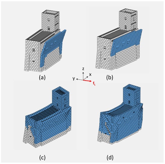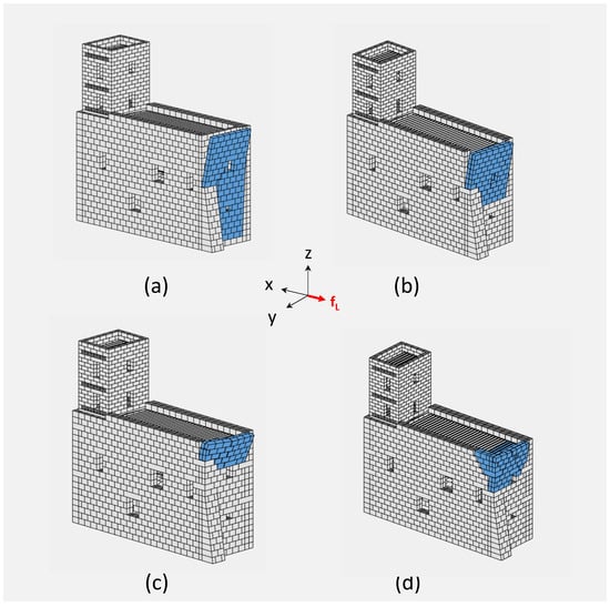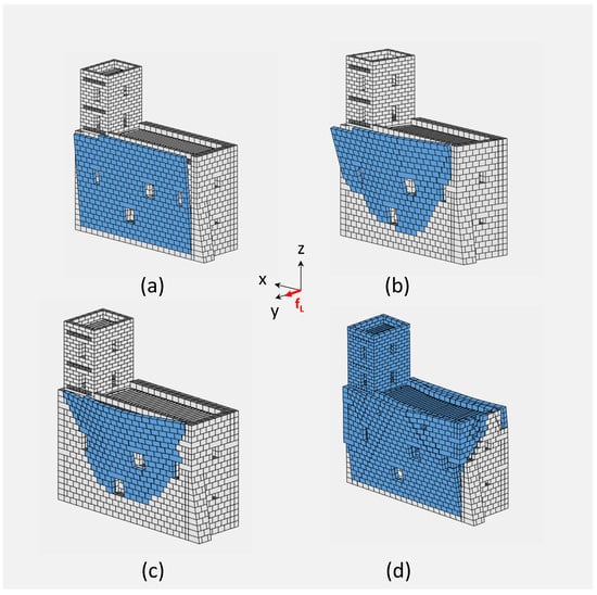 Figure 12d and Figure 13d report the collapse mechanisms for the load cases LC1 and LC2 (along the x-axis) where a single tie force was applied to the washer-bearing plates located on the F2 and F4 façades. Figure 14d and d highlights the failure modes for the load cases LC3 and LC4 (live loads along the y-axis), considering the effects of two ties applied to the four plates located on the F1 and F3 façades. In such case, global mechanisms were obtained with a damage distribution along the whole structure.
