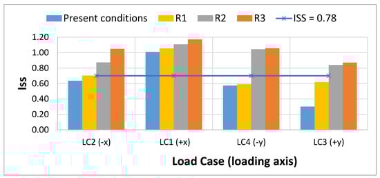 In order to better stress the effects induced by the different applied retrofitting interventions, the results of the analysis were also compared in terms of seismic safety index Iss defined in Reference [32] as the ratio between the seismic capacity at the life safety limit state (PGAcap) and the seismic demand (PGAdem) defined by Equations (3)–(5).
