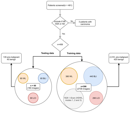 The data collection was carried out in a prospective fashion, according to a predefined image acquisition protocol, in the Maastricht University Medical Center+ (MUMC+) and the Catharina Hospital Eindhoven (CZE), both in the Netherlands, and the Queen Alexandra Hospital in Portsmouth, United Kingdom. The training dataset consisted of a total of 468 patients, with 2319 pre-malignant polyps and 420 benign, with CRPs of all sizes, from diminutive polyps to large polyps. The dataset includes polyps acquired in WL, BLI, LCI, and I-Scan (HDWL; Mode 1, 2, and 3) modalities. Using I-Scan data adds robustness to the algorithm, as all modes have almost similar visual properties as the three other modalities. The test set was restricted to 60 patients to match with the exact same patients analyzed by endoscopists (further explained in Section 2.6). All the test set was acquired from CZE, with 45 patients identified as pre-malignant polyps and 15 benign. For each test patient, a single image of the polyp was acquired at different time steps with three different modalities—WL, BLI, and LCI—adding to a total of 180 polyp images. Figure 1 summarizes the data collection described above. All collected data was made fully anonymous prior to the study.