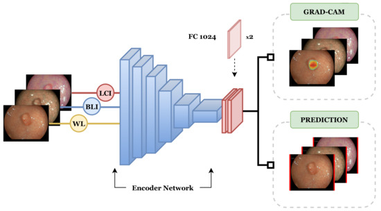 The best CADx system achieves an accuracy of 95.0% with specificity of 93.3%, sensitivity of 95.6%, and AUC of 0.97. For each input image, the CADx system computes the region for decision-making via Grad-CAM and the malignancy prediction. The average prediction of the three modalities offers the endoscopists with the best possible diagnosis result. The end-to-end framework described above is depicted in Figure 2.