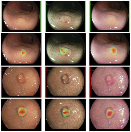 Output generated from the CADx system where an image of a colorectal polyp (CRP) is received from the endoscope. Two outputs are presented, (1) a prediction of whether the polyp is benign (green) or pre-malignant (red), and (2) a GRAD-CAM map that allows the endoscopists to judge the decisions of the CADx. From left to right, the three modalities employed in this study are shown: White Light, Blue Light Imaging, and Linked Color Imaging. In the first row, a benign polyp is predicted from the three modalities with the CADx system decision shown in the following row. In the third and fourth rows, a pre-malignant polyp is predicted from the combined modalities.