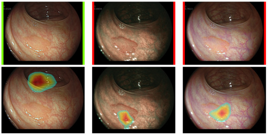 During the assessment of CRPs, the CADx system provides the endoscopist with a quantitative measure of how likely the observed CRP is to be benign or pre-malignant. Although a probability measure might be sufficient for agreement between the system and the endoscopist, there is a likelihood that a visual inspection of the polyps is required for further confirmation. Gradient-weighted Class Activation Mapping (Grad-CAM) [37] is an effective method that allows the visualization of the decision region of a CNN. Through the average product of the feature maps and a class-activation function, we are able to produce a visual map and add explainability to the endoscopist’s observations.