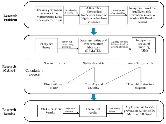 The following research process is designed in this paper. First of all, the research theme is clarified and the risk prevention system of the maritime Silk Road is constructed. Then, we invited experts in related fields to revise the index system and fill in the questionnaire. Next, the calculation results are obtained by exploring the Fuzzy-DEMATEL and ISM models. Finally, a complete intelligent risk prevention system is founded for the maritime Silk Road. The whole process is shown in Figure 1.