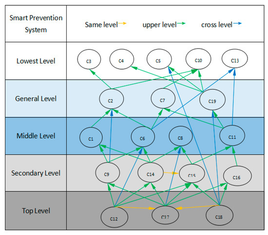 Although DEMATEL method can calculate the importance degree of a specific prevention method in the influencing factor system, it cannot determine the internal correlation of the prevention method and divide the hierarchy, so it is difficult to effectively manage and control the prevention method. Therefore, this paper uses ISM method to classify the system structure. The ISM method can transform fuzzy ideas into intuitive ones with good structural relations, and is suitable for system analysis with many variables, complex relations, and an unclear structure [47].