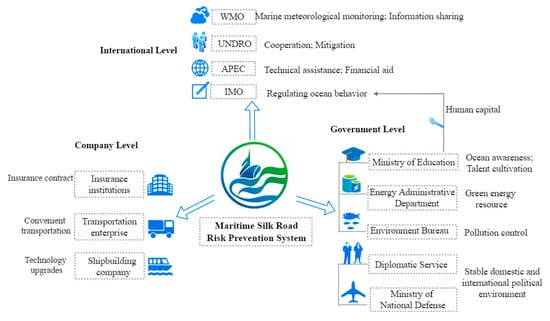 The model can be divided into three levels: international level, government level and company level. First, WMO can develop the observation network of the global marine operations project, maintain, coordinate and fully integrate the ocean observation system [45]. International cooperation organizations for disaster reduction can launch the “Marine Silk Road” Marine disaster risk assessment and scientifically delimit key marine disaster protection zones [57]. International economic organizations such as APEC could collaborate on projects to provide technical assistance to less able countries [60]. In addition, the International Maritime Organization may issue a license to regulate the marine behavior of states. Second, the levels of government include national ministries of foreign affairs and coastal defense, as well as national environmental agencies, energy control centers and national education departments. The state’s foreign affairs and coastal defense departments should formulate a reasonable foreign policy and defense system to provide a stable domestic and international environment for the development of the Marine Silk Road.