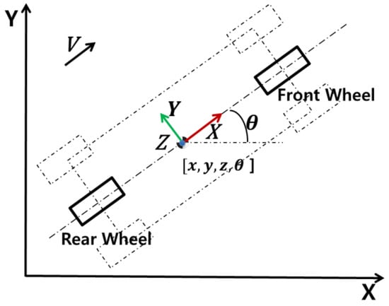 This section describes the implementation of the extended PAUKF. As is assumed with the initial PAUKF, the environment was taken as Markov, meaning that the current state depends only on the previous state. A bicycle model was used for making a prediction model of particles, as is shown in Figure 1. We assumed that the changes in steering and slip angle information were included in the yaw angle. From the XY plane, outside of the page, is the positive Z direction.