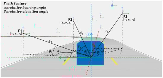 It is necessary to calculate the error of the predicted mean value and the measured value of each particle, in order to calculate the weight. On the basis of the error of predicted and measured values, the weight of each particle can be calculated. Since the predicted value is calculated in the prediction step, the only parameter that affects weight is the measurement value. In this paper, the extended PAUKF considered the three-dimensional features from the perception module, such as LiDAR- and RADAR-based object recognition. Since the range sensor calculated the distance between features based on time of flight, the measured distance is the point-to-point distance, as Figure 2 shows. The method differs from the two-dimensional case. Because of the vertical offset of the features, the weight calculation should also be extended to a higher dimension. The only known measurement values are the point-to-point relative distance between vehicle and feature F as well as the angle of the relative bearing and relative elevation , as Figure 2 shows. The geometry perception data should be considered as well as the noise affection in the vertical direction.