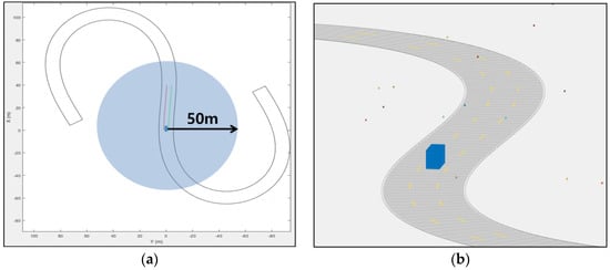 The simulation environment is based on the MATLAB autonomous driving toolbox. The whole algorithm is made in MATLAB .m file. Since previous research proved no significant differences between S shape roads and straight roads, in this paper, only the S shape road with the 50 m range of perception limit was used, as shown in Figure 3a. The three-dimensional features are generated randomly along the road, as shown in Figure 3b.
