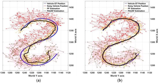 (a) Position estimation result of the basic particle-aided unscented Kalman filter (PAUKF) at 60 km/h; (b) position estimation result of the extended PAUKF at 60 km/h.