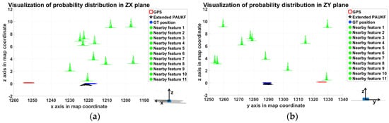 Figure 5 shows the visualization result of the probability distribution of the features’ position, the ground truth position, the position from the GPS, and the estimated position from the extended PAUKF at 250th sample time. In order to make the figure easy to understand, the origin coordinate of probability distributions translates into the position of features, GPS, and vehicle. One thousand random numbers were used for visualizing the probability of each parameter. In the figure, the red square value is the position from the GPS, the black color with start marker is the position that is estimated from the extended PAUKF, and the blue data with the square is the ground truth data of the vehicle. The figure shows that all the features have different vertical values. The position from the GPS has a large error in relation to the ground truth data. The position from the extended PAUKF estimation is closest to the ground truth data. The extended PAUKF fused the surrounding feature position information to localize the vehicle itself in the map coordinates. This shows the effectiveness of the extended PAUKF.