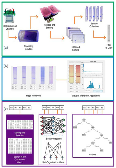 Diagram of the system, divided into three phases: First phase (in green square) is about electrophoresis process. Second phase (in blue square) is about feature extraction with wavelet transform. Third phase (in purple square) is about the three intelligent paradigms tested: (a) Content Based Image retrieval System, (b) Neural Networks (Backpropagation and Self Organization Maps) and (c) J48 Decision Tree.