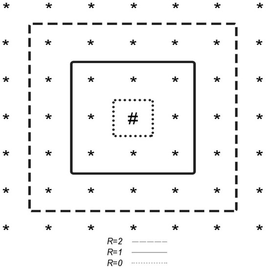 Network of a rectangularly-generated neighborhood, where # is the winning value, ∗ are the neighboring values, points closest neighbors, line moderately close neighbors, and script farthest neighbors (taken from [19]).