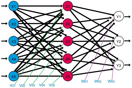 Architecture of a back propagation neural network made up of five input neurons in the input layer in (blue), a hidden layer with five neurons in (red), an output layer with three neurons in white. The weight values with influence in the hidden layer are . The weight values with influence in the output layer are . Therefore, this neural network was designed for three classification groups, as can be observed in the output layer.