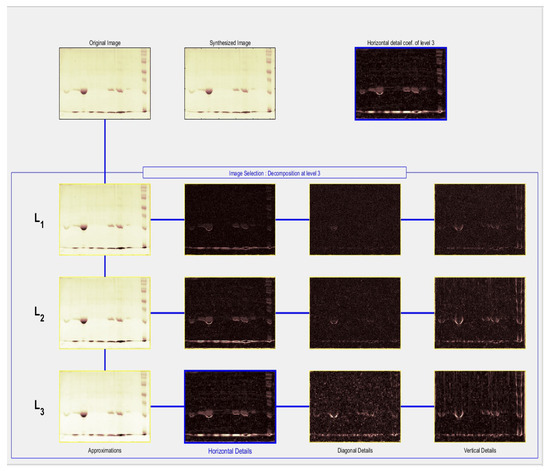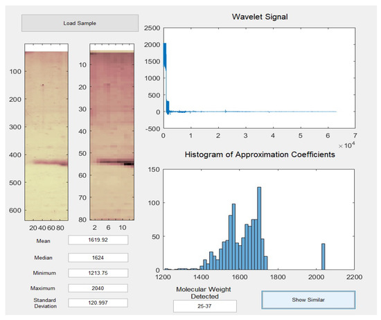 To perform the selection of the wavelet transform, Haar, biorthogonal, and Daubachies were tested, achieving similar results. However, only the Daubechies results are shown, because the visual coefficients of greater importance in the protein signal content highlight the molecular weight score. Then, the decomposition levels are analyzed, where the wavelet transform Daubechies showed with a higher illumination, the said protein score. On the other hand, the parametric statistics and the histograms obtained established an analogy between the detection of molecular weights and the electrophoresis samples.