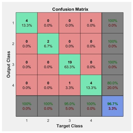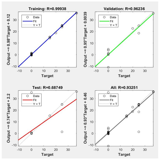 We observed that in the performance of the training phase, most of the cases remained close to or within the optimal results line. In the training phase, there was a small change in the direction of the fit and four cases moved away from the optimal line with an error of 0.99938 (see Figure 17 up and left). For the validation phase (Figure 17 up and right) the greatest change in the direction of the fit line was noted, and four molecular weights were not correctly classified and an error of 0.9636 was obtained. In the test phase (Figure 17 down and left), six items were misclassified, so the error is 0.68749. Finally, it is shown in Figure 17 down and right that the error for three phases is of 0.93251.