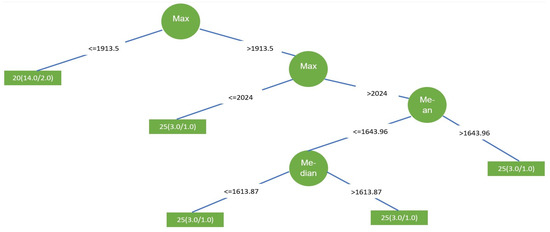 The back propagation neural network was designed with a 5-5-4 architecture, because there are five characteristics considered in the input. There are five nodes in the hidden layer, which the programming used assigns by default. There are also four output nodes, which are precisely the molecular weight groups to be measured. In the case of the SOM neural network, it was designed with a 5-4 architecture, that is, there are no hidden layers, there are five input nodes (mean, median, minimum, maximum and standard deviation). There are four exit nodes, which are the four molecular weight groups that you want to measure. In the case of the decision tree, as can be seen in Figure 15, there are four nodes, which is the number of decisions that must be made to classify the measurements of the four groups of molecular weights. The tree is also fed with the five statistical variables that were already mentioned and the generation of nodes takes place according to the ranges included in the statistical data.