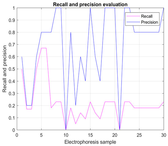 The value of Answer Set always will be of 5, because the system and the interface was programmed for to browse five retrieved images. Figure 16 graphically shows the results of the recall and precision evaluations obtained from the 30 electrophoresis samples.