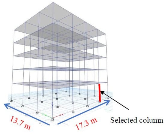 In the experiment, since each specimen was dynamically loaded with displacement control the displacement history of each specimen was obtained from a non-linear analysis of a selected traditional low-rise street house in Taiwan. Therefore, the designed specimens were assumed to be the column members in a selected building structure. Figure 1 shows that the selected building structure had five floors with a horizontal span (four spans in total) of 17.28 m and a longitudinal span (three spans in total) of 13.68 m. The first floor was 3.6 m high, and the other floors were 3 m high. The slab thickness of each floor was 12 cm. The cross-sectional sizes of all columns and the properties of the reinforcement and material in the structure were those of the specimens. These specimens had the same tensile reinforcement ratio. Three stirrup ratios were utilized to distinguish three failure modes, which were flexural failure, flexural-shear failure, and shear failure. Two spacing arrangements of the transverse reinforcement in the specimen section were designed and used in this work, as shown in Figure 2. The building was located on a second-category ordinary site in Jiangjun Dist., Tainan City. Consistent with the seismic design specifications for buildings in Taiwan, the seismic demand of the building was SDS = 0.7 and SD1 = 0.52, and the peak ground acceleration AT was 0.28 g, which are consistent with a design earthquake with a returning period of 475 years.