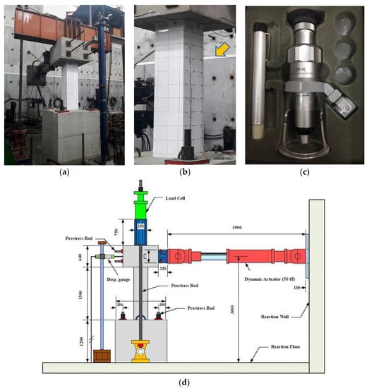 Gu et al. [] studied the monitoring of the health of circular concrete columns to determine their structural performance under earthquake loading by analyzing the responses of piezoelectric ceramic transducers. Liao et al. [] observed the structural damage status, including the degree and location of cracking damage, of in situ SHM using post-embedded piezoelectric sensors on RC bridge piers in Taiwan under reversed cyclic excitation. Chang et al. [] investigated the effectiveness of piezoceramic transducers for monitoring structural health and developed a damage level index for multi-story RC frame structures in a shake table test. Liao and Jean [] studied the properties of structurally damaged RC shear walls with shear failure using the receptivity of piezoceramic transducers under reversed cyclic loading. Recently, Liao et al. [] applied the SHM method to post-installed shear walls in an RC frame under seismic excitation, and they used post-embedded piezoelectric sensors to identify surface deterioration around the boundary connections among structural elements of retrofitted walls, columns, beams, and foundations. Most such uses for column members under dynamic loading have involved the monitoring of structural health using piezoelectric-based sensors. Chiu et al. [] used pre-embedded and post-embedded piezoceramic transducers to perform crack-based damage quantification in full-size high-strength RC column specimens under cyclic loading. They found that pre-embedded piezoceramic transducers were more sensitive to maximum residual crack width than were the post-embedded piezoceramic transducers, especially for shear cracks. They also found that piezoceramic transducers are not suitable for the SHM of severely damaged RC columns. The values of the damage indices that were obtained using such sensors were more strongly correlated with crack width. Chiu et al. [] introduced a normalized damage index, which they referred to as the “crack damage index”, and suggested a limiting value of this damage index at each damage level. Their results revealed that the proposed piezoceramic transducer has potential for use in the SHM of an RC column.