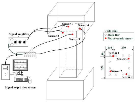 A piezoelectric sensor set consists of a circular piezoceramic disc, a low-frequency paired cable and a BNC (Bayonet Neill-Concelman) connector. Table 2 presents the parameters of the circular piezoelectric transducer, which had a diameter of 20 mm and a thickness of 1 mm. The positive and negative ends of the cable were connected carefully to the sides of a piezoceramic disc electrode and the other free ends were soldered to the BNC adapter (Figure 4). Piezoelectric ceramics are vulnerable to moisture from fresh concrete, so they were sprayed with a thin black layer of waterproof solution. Before the non-shrinkage mortar was sealed, the piezoelectric-based sensor system was inserted into the prepared drill hole at a depth of 80 mm. Figure 5 shows the installation phases and locations of the four sensor units that were embedded in a column specimen. For each specimen under the applied loading system shown in Figure 3d, the moment of a section near the top end of each specimen was relatively lower than that of the other sections. Therefore, in order to avoid the failure of the PZT sensors in the experiment, they were embedded near top end of each specimen.