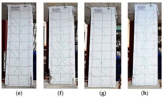 Damage pattern of each specimen after dynamic testing. (a) FF-15S-II; (b) FF-15S-III; (c) FF-15S-IV; (d) FSF-15S-II; (e) FSF-15S-III; (f) FSF-15S-IV; (g) SF-30S-II; (h) SF-30S-III.