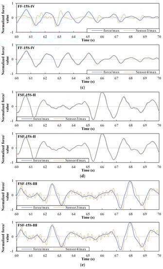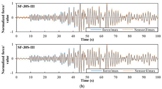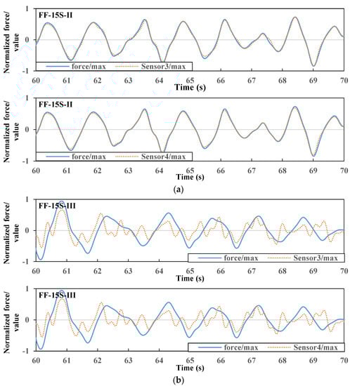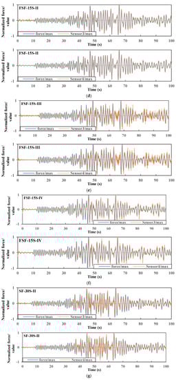 Table 5 provides the coefficients of correlation between the voltage signals that were obtained from a post-embedded piezoceramic sensor and the forces that were applied to a specimen under dynamic loading. According to the table, Sensor 3 and Sensor 4 were more stable than Sensor 1 and Sensor 2 because their voltage signals were not processed by the charge amplifier. Since the charge amplifier in the test had unstable filtering functions, the correlation coefficients of Sensor 1 and Sensor 2 were smaller than those of Sensor 3 and Sensor 4. With respect to all specimens, Figure 11 compares the signals from Sensor 3 and Sensor 4 with the applied forces. When the signals from Sensor 3 and Sensor 4 were normalized using their corresponding maximum values, their waveforms were similar to the normalized applied forces, except for specimen FF-15S-III. For specimens FF-15S-II, FSF-15S-II, FSF-15S-IV, and SF-30S-III, since the coefficients of correlation exceeded 0.9, their normalized signals varied almost exactly with the normalized applied forces. Figure 12 presents a window view of each figure in Figure 11 with a window size set to a period of 60–70 s. Clearly, based on Figure 11 and Figure 12 and Table 5, the post-embedded piezoceramic sensor has the great potential for use in estimating the maximum force applied in an earthquake.