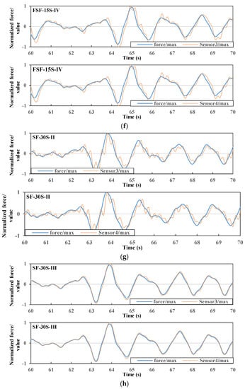 The waveform comparison between the sensor signals and applied force of specimens. (a) FF-15S-II (Sensor 3 and Sensor 4); (b) FF-15S-III (Sensor 3 and Sensor 4); (c) FF-15S-IV (Sensor 3 and Sensor 4); (d) FSF-15S-II (Sensor 3 and Sensor 4); (e) FSF-15S-III (Sensor 3 and Sensor 4); (f) FSF-15S-IV (Sensor 3 and Sensor 4); (g) SF-30S-II (Sensor 3 and Sensor 4); (h) SF-30S-III (Sensor 3 and Sensor 4).