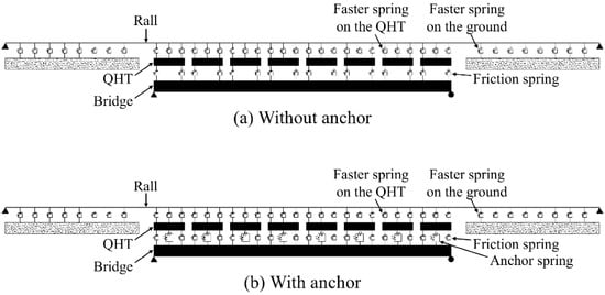 As interaction analysis models used in previous studies [25,26] comprise the rail and bridge, spring elements were introduced only for a fastener spring. This study expands the model to the rail–track–bridge system that considers the rails, QHT, and bridge. A full sequential analysis should include both the rail fastener spring between the rail and the track and the friction spring between the track and the bridge.