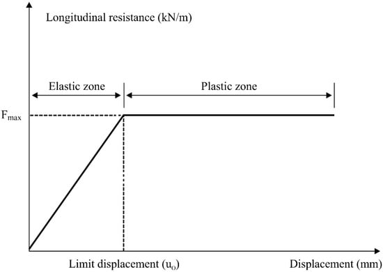 As rails are connected by rail fasteners installed on the sleepers embedded in the track slab, rails and track slabs are connected to each other using a spring element that replicates the longitudinal resistance of rail fasteners (hereinafter referred to as the “fastener spring”). The longitudinal resistance by a fastener is replicated using a bilinear spring that exhibits elastic-perfect plastic behavior, as shown in Figure 3. The displacement that sets the boundary between the elastic and plastic zone is defined as the limit displacement (u0). Until the displacement is less than the limit displacement, the rail pad itself deforms due to elastic shearing. After the limit displacement is exceeded, the rail slips over the rail pad, and the longitudinal displacement increases between the rail and the track slab. When there is no train on the track, the longitudinal resistance is determined by the normal force due to the clamping force of a fastener and the friction coefficient of a rail pad. When there is a train on the track, the longitudinal resistance is determined by the vertical load of the train and the friction coefficient of a rail pad. Therefore, the maximum longitudinal resistance of a fastener spring is different when there is a train load (60 kN/m) and when there is no train load (40 kN/m), as suggested in UIC 774-3R [16]. The limit displacement is generally as small as 0.5 mm in the same code.