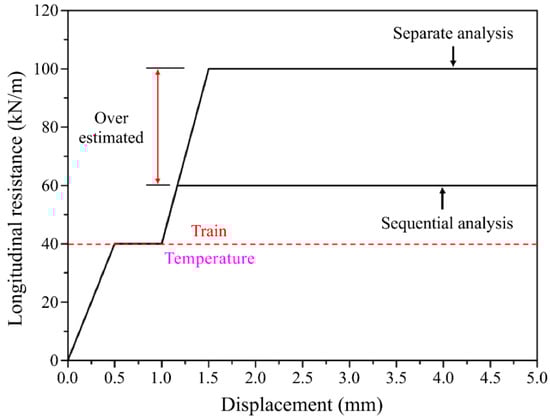 There are two methods for deducing track–bridge interactions. First, a separate analysis method simply sums the stress and deformation generated by the temperature and train load, respectively. Second, a sequential analysis method solves the stress and deformation in a sequential manner in the order of temperature and train-load generation. Sequential analysis faithfully examines the behavior of the track and the bridge; however, its implementation is rather complicated. It is known that separate analysis conservatively evaluates rail stress compared to sequential analysis, whereas it is the other way around with regard to displacement [24]. A separate analysis is commonly conducted in field projects, as investigated in previous studies [19,20,21,22,23]. For implementing sequential analysis, the structural properties of the longitudinal resistance of the track should consider the existence of train load after temperature changes [25,26]. As the longitudinal resistance normally comes from a rail fastener in a typical slab track, the typical sequential analysis considers nonlinear behavior between the rail and track without the frictional behavior between the track and the bridge.