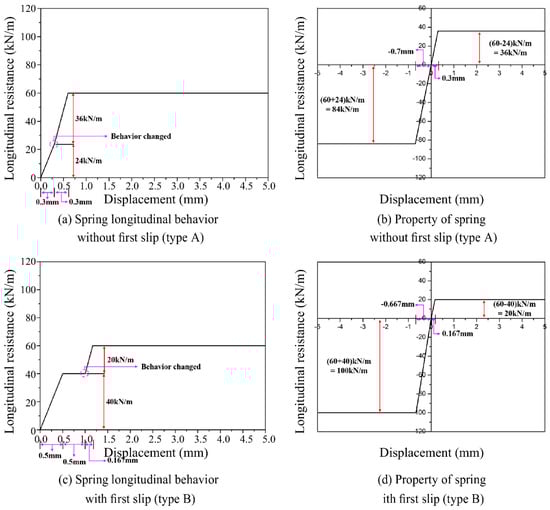 Figure 5 shows the example of the nonlinear behavior of the longitudinal resistance spring. Spring type A is for when the train load is applied while the longitudinal resistance spring is within the elastic range due to the temperature load; spring type B is for when the train load is applied when a longitudinal slip has occurred and the longitudinal resistance reaches its maximum limit owing to a temperature change.