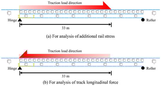 This sequential analysis scheme is used for analyzing the track–bridge interaction for the target bridge (Figure 2 and Table 1). The temperature, train traction, and train vertical load are applied in compliance with the related standards [15,16], as shown in Table 3.