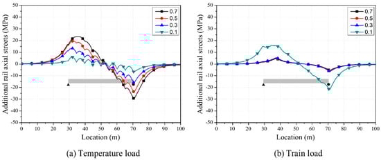The additional rail axial stress due to temperature load increases with an increase in the friction coefficient (Figure 7a). The longitudinal bridge expansion due to a temperature change is delivered to the rail by friction and fastener springs, thereby causing additional rail axial stress. The additional axial stress on rails decreases as the longitudinal resistance from friction gets smaller, as transferred displacement from the friction layer gets smaller.