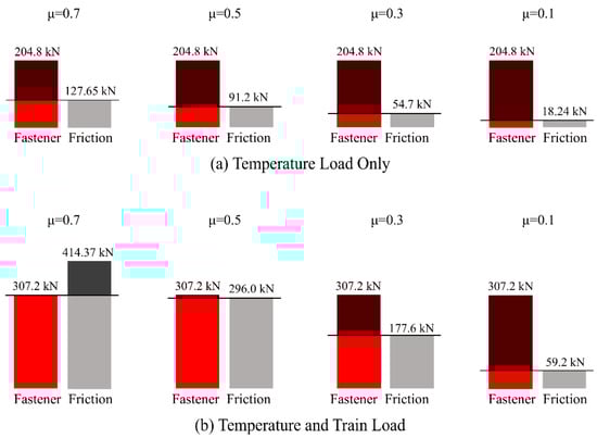 When only the temperature load was applied (Figure 8a), the frictional longitudinal forces were smaller than the fastener longitudinal forces for all friction coefficients; thus, track segments slipped over the bridge deck. When both temperature and train loads were applied and the friction coefficient was 0.7 (Figure 8b), the frictional longitudinal forces were greater than the fastener longitudinal forces when the rail slipped over the fasteners. The maximum fastener longitudinal force, 307.2 kN, was calculated by multiplying the segment length of 5.12 m with the maximum fastener longitudinal forces of 60 kN/m under the train load. When the friction coefficient equaled 0.5 or less, the maximum frictional longitudinal forces were smaller than the maximum longitudinal forces of the rail fasteners. In this case, the track segment slipped over the bridge deck because a longitudinal load greater than the frictional resistance was applied.