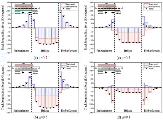 Figure 9 shows the applied longitudinal forces to each segment according to the friction coefficients. When the friction coefficient was 0.7 (Figure 9a), the bridge expanded in the negative direction when a temperature load was applied to the bridge and QHT, while the rail fasteners exhibited resistance in the negative direction because they resisted the movement of the bridge. The longitudinal load due to temperature load reached the maximum frictional resistance of 127.65 kN, thereby generating a track segment slip over the bridge deck. When the train load was applied, the rails were pushed in the negative direction. Fastener springs were applied with a longitudinal load in a negative direction for all sections. The maximum longitudinal load under a train load was 196.9 kN, which was less than the maximum longitudinal resistance of 307.2 kN with the train load taken into consideration, thereby not generating an additional slip.