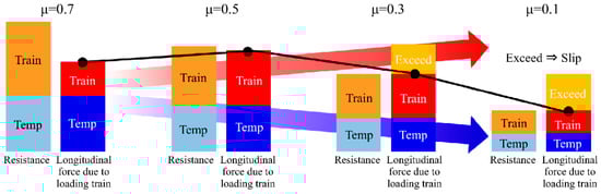 When the friction coefficient was 0.1 (Figure 9d), the maximum frictional resistance was 18.24 kN, which is very small; thus, track segments slipped due to the temperature load. Even when the train load was applied, the maximum longitudinal resistance remained at 59.2 kN; thus, the track segments slipped additionally under the train load as well.