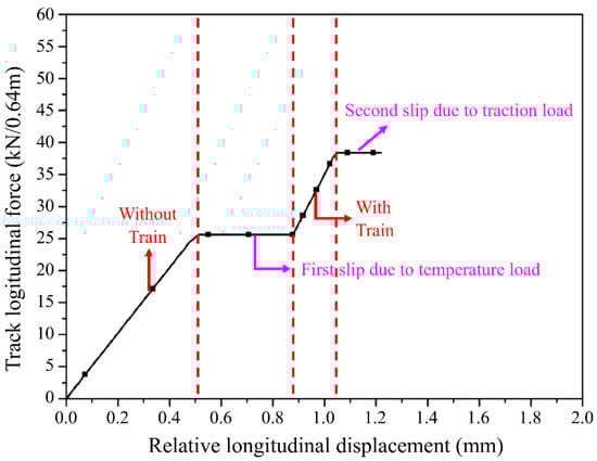 The longitudinal displacement generated in a fastener spring is the relative displacement between the rail and QHT slabs. The longitudinal displacement generated in a friction spring is the relative displacement between the bridge deck and the QHT segment slabs. Figure 11 presents an example showing the behavior of a nonlinear resistance spring in a sequential analysis. The first slip occurs due to temperature when the maximum longitudinal resistance is reached due to the temperature load; subsequently, the secondary slip due to the train load occurs when the train load causes the maximum longitudinal resistance to be exceeded.