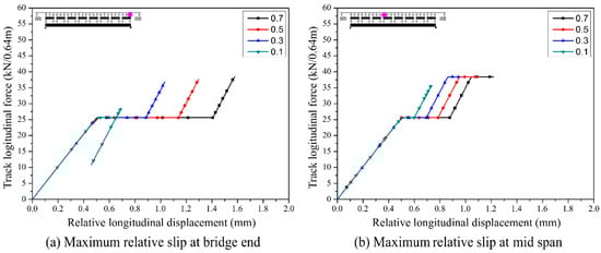 A relative slip between the track and bridge due to the temperature load occurs in all cases regardless of the friction coefficient because it is only supported by the frictional resistance from the self-weight of the track slab. In contrast, a relative slip due to train traction load occurs at the critical friction coefficient of 0.3 or below.
