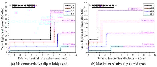 When the friction coefficient was 0.5 (Figure 9b), the frictional resistance due to temperature load reached its maximum of 91.2 kN; thus, the track segments slipped. The maximum longitudinal load under a train load was 244.2 kN, which did not exceed the maximum longitudinal resistance of 296.0 kN under a train load, thereby not generating an additional slip due to train operation.