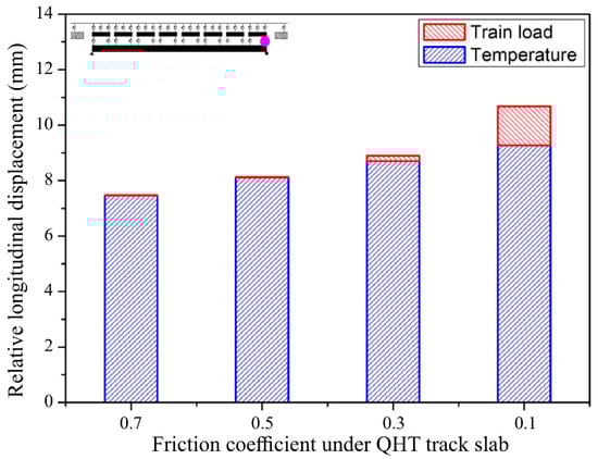 The maximum slip of the QHT segment occurred in the roller support at the right end of the bridge (Figure 14). Longitudinal relative displacements of 7.46 mm and 0.01 mm occurred due to the temperature and train loads, respectively, when the friction coefficient was 0.7. Longitudinal relative displacements of 9.27 mm and 1.40 mm occurred due to the temperature load and train load, respectively, when the friction coefficient was 0.1.