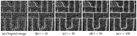 In this section, we present an algorithm to detect curvilinear structures based on the representation obtained by the proposed recursive anisotropic diffusion process. Let be a representation obtained from the proposed algorithm described in Algorithm 1, where the anisotropic diffusion process is recursively applied. The detection of curvilinear structures is often desired in a variety of imagery domains such as those involving medical images, satellite images, electronic designs, and maps. Features of interest forming curvilinear structures are better characterized when insignificant details are suppressed so that these curvilinear structures can be more easily detected. An algorithm for detecting curvilinear structures is developed based on the analysis of local image features [41,42,43], where the directional derivatives are used to determine the orientations of the curvilinear features as proposed in [4]. Let be a parameterized curve from . The magnitude of the second derivative at the point where can be used as a saliency measure to characterize linear features. Positive contrast due to bright lines on a dark background is characterized by , and negative contrast due to dark lines on a bright background is characterized by . The characteristic kernel for linear features can be defined by