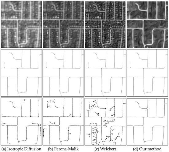 We apply a curvilinear detection algorithm based on the saliency measure on the characteristic representations with respect to linear features obtained via isotropic diffusion using a Gaussian kernel, anisotropic diffusion using a scalar diffusivity function, anisotropic diffusion using a vector-valued diffusivity function, and our recursive anisotropic diffusion algorithm. The detection of curvilinear features is visually presented in Figure 4, where the detection results are shown on the bottom row, the ground truth on the middle row, and the obtained diffused images on the top row. Figure 4 shows the diffusion images that were obtained via (a) isotropic diffusion, (b) the anisotropic diffusion method developed by Perona–Malik, (c) the coherence-enhancing method developed by Weickert, and (d) our proposed diffusion algorithm, from left to right. The ground truth for the detection of fissures in lung CT images was obtained by the radiologist with manual annotations. For the detection of roads in the satellite images, the ground truth was obtained by human annotations based on the assumption that the central lines between relatively large blocks are likely to be roads. As shown in the detection results, our proposed algorithm has better accuracy and fewer false positives.