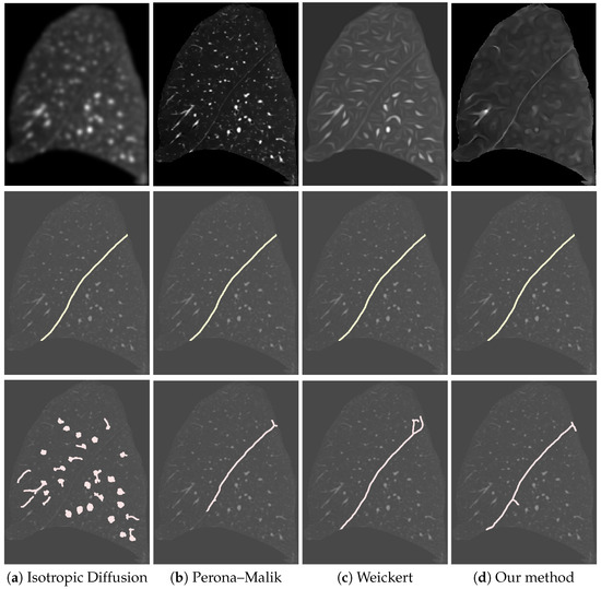 The results of fissure detection in the sagittal plane lung CT image are presented in Figure 5, where the diffused images are shown in the top row, the ground truth for the fissure to be detected is shown in the middle row, and the detection results for the fissure are shown in the bottom row. The diffused images shown in Figure 5 were obtained via (a) isotropic diffusion, (b) anisotropic diffusion method proposed by Perona–Malik, (c) coherence-enhancing diffusion method proposed by Weickert, and (d) our proposed algorithm, from left to right. As shown in the detection results, our algorithm outperforms the other algorithms in terms of both accuracy and sensitivity.