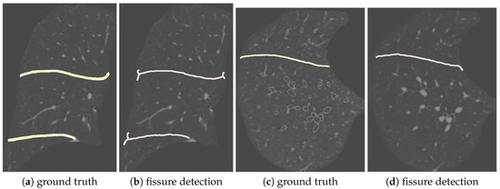 Visual illustration of the fissure detection results in lung CT images. (a) Ground truth and (b) fissure detection for the coronal plane. (c) Ground truth and (d) fissure detection for the axial plane.