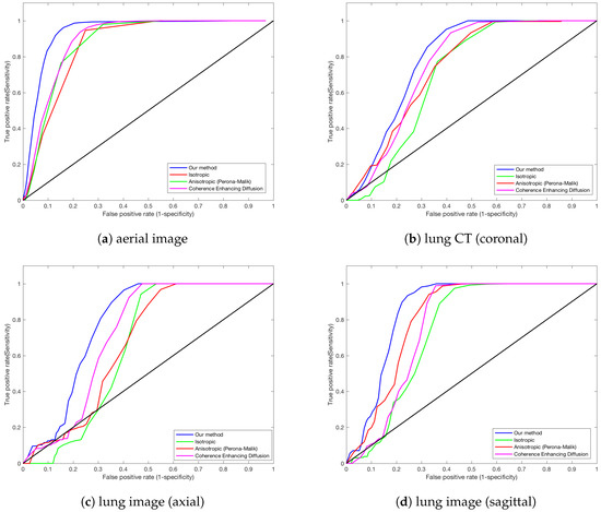 Quantitative comparison of the ROC curves for curvilinear structure detection in (a) an aerial image, and in (b) coronal, (c) axial, and (d) sagittal plane lung CT images. Our proposed algorithm (in blue color) is compared with the others, namely isotropic diffusion (in green color), anisotropic diffusion by proposed Perona–Malik (in red color), and coherence-enhancing diffusion proposed by Weickert (in pink color).