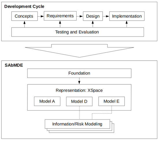 A development cycle model represents the phases of system and/or product development. There are many such models currently in use. For example, Microsoft offers their Security Development Lifecycle [1,2]. The National Institute of Standards and Technology (NIST) and other government organizations specify standards and instructions [3,4] that are necessarily incorporated by industry [5,6]. Researchers, such as [7], have often enumerated and compared various methodologies. However, all these models and methodologies represent a developer’s effort to convert a concept into an end product. The models describe the intermediate requirement, design, and implementation phases as well as the testing phase that maintains the integrity of the conversion process. The top half of Figure 1 illustrates this representation in broad terms.