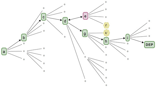 A development agent navigates or traverses DSpace by deciding which DNode to compose next. Figure 2 shows a DPath. Note that the DPath is not a direct one. The decision to traverse to DNode e was a mistake that had to be corrected. An evaluation of DNodes f and k confirmed the error. Thus, the actual DPath is contorted. At each DNode, the structure of DSpace offers a probability floor for the agent’s likelihood of making a successful decision, i.e., one that leads to the DEP. Those floor values are defined by (3)–(5), and they correspond to random choices. In real situations, agents act with some level of skill. To recognize this skill, the DNode probabilities are scaled with a 0–10 (random-perfect) index, , as in (6).