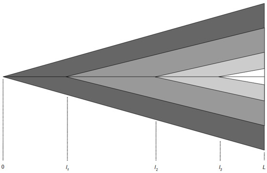 Given this definition, a quantity of information can be assigned to a DNode using the probabilities (4) and (5). A DSpace is a union of DNodes. Equation (8) computes the number of DNodes in a DSpace defined by , , and L; therefore, (9) defines the total information in that DSpace as it is viewed from the DSpace origin.