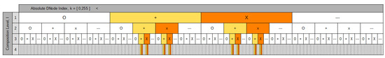 For the first example, define a test set, , with members (22)–(24). defines a DEP as a contiguous sequence of a specified member of V, in this case, X. Table 2 lays out the traversal mechanism using and (25) applied to the example DSpace. For this simplified example, the DEP DPath stands out as the darkest highlighted X cells in Figure 5 and the low points in Figure 6. The stark distinction of the single DPath is a consequence of the (22) test’s specificity. Equation (22) selects DNodes with 100% certainty, it is known at the first composition, and it applies to every subsequent composition.