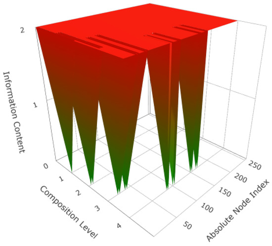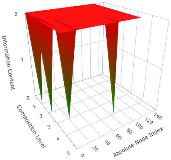 Application of test set and (27) identifies the 16 DPaths highlighted in Figure 5. Table 3 shows the states of the traversal mechanism, at each composition index, as it drives those DPaths toward their corresponding DEPs. Table 4 also shows the test results, the DNode probabilities, and the information for each DPath. Figure 7 is a graphical representation of Table 4. As hypothesized, the relative information values distinguish the DPaths from one another. At any composition level, an agent can compute the likelihood that the current DPath is the best one. Or, to the degree that the agent projects the DPaths forward (as has been done here), the agent can get a sense of the best DPath options.